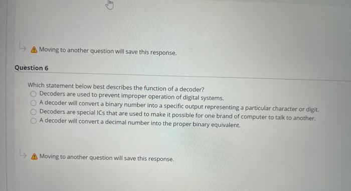 A decoder will convert a binary number into a specific output representing a particular character or digit. Which statement below best describes a Karnaugh map. Will convert a decimal number into the proper binary equivalent Decoders are used to prevent improper operation of.